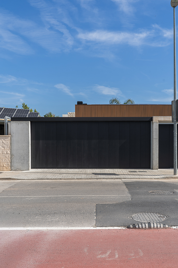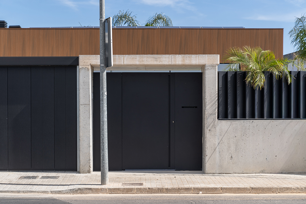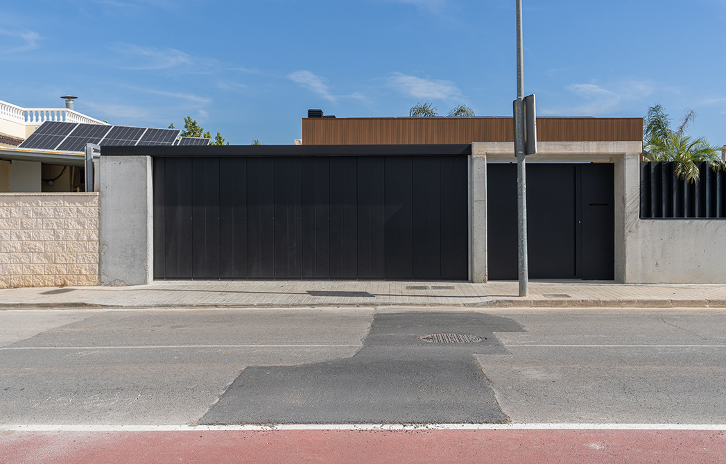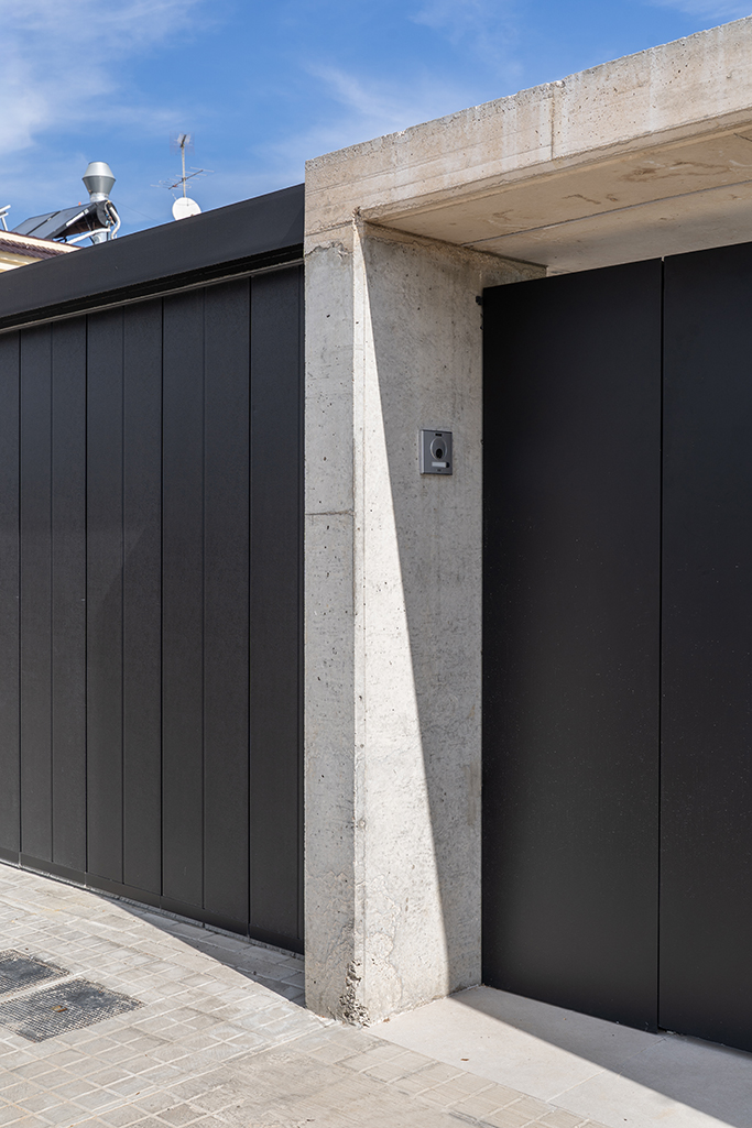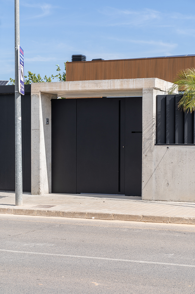 • Vallado perimetral de lamas: Diseñamos un sistema de lamas verticales en acero, calculando la separación exacta para cumplir con un doble objetivo: garantizar la privacidad de los residentes desde el exterior y permitir una permeabilidad visual y de luz desde el interior de la vivienda.
