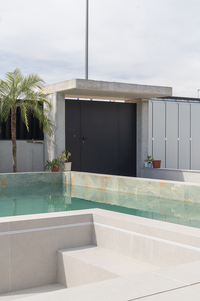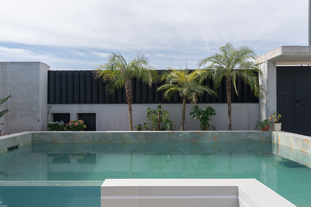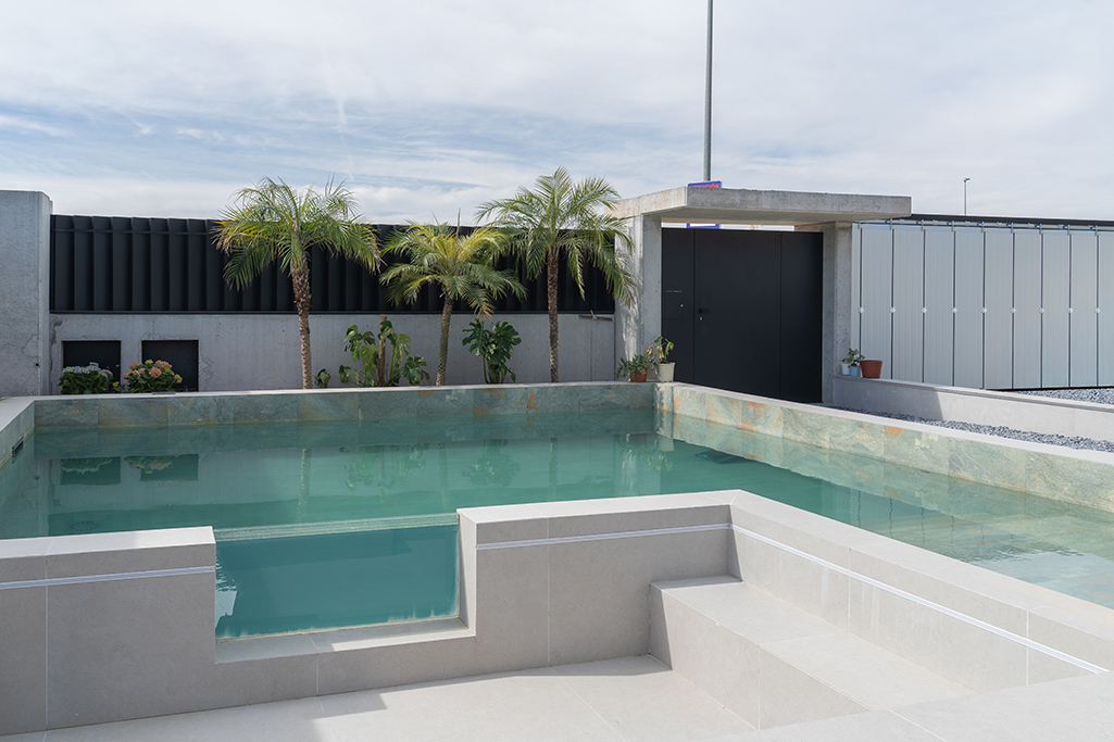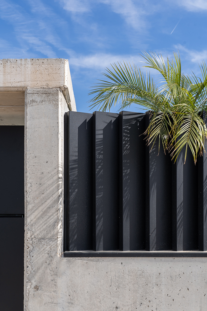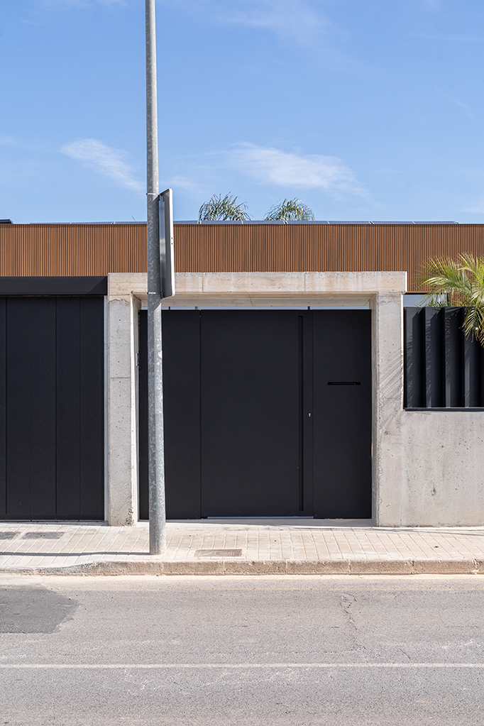 • Vallado perimetral de lamas: Diseñamos un sistema de lamas verticales en acero, calculando la separación exacta para cumplir con un doble objetivo: garantizar la privacidad de los residentes desde el exterior y permitir una permeabilidad visual y de luz desde el interior de la vivienda.