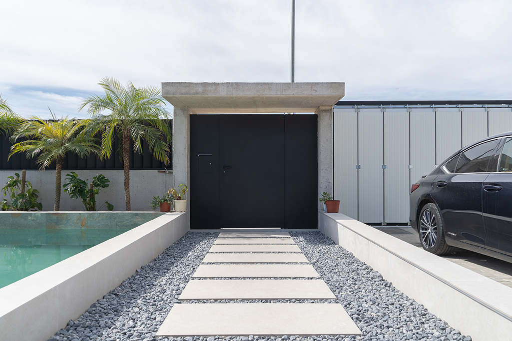 • Puerta de acceso principal: Fabricamos e instalamos un sistema de acceso enrasado a dos caras, eliminando marcos visibles y logrando una continuidad total con el paramento. La integración incluye elementos funcionales como el buzón y sistemas de apertura inteligentes, manteniendo una estética limpia y robusta.
